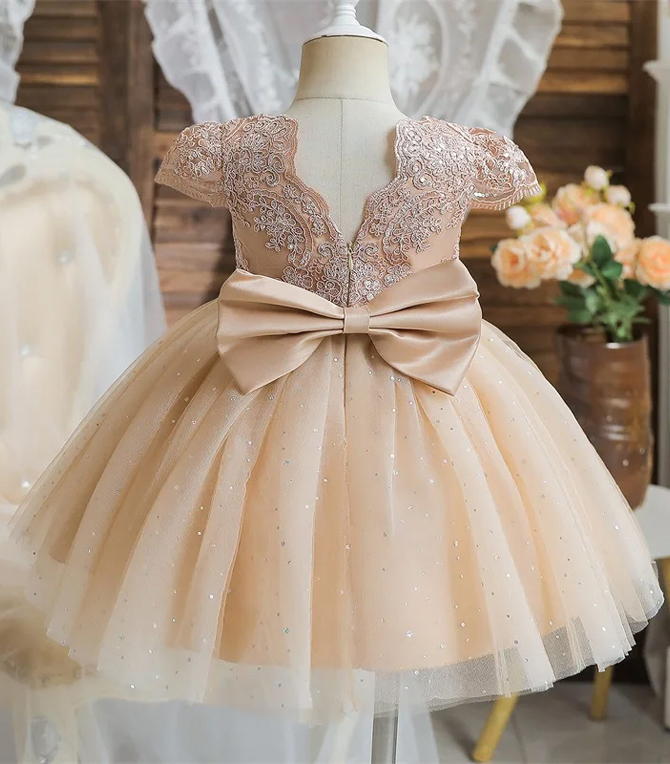 A gentle shimmer of celebration—this light gold frock adds a magical glow to your little star’s special day.